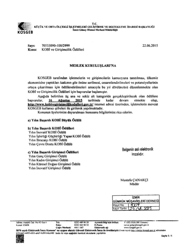 KOSGEB İzmir Güney Hizmet Merkezi Müdürlüğü’nden alınan “KOBİ ve Girişimcilik Ödülleri” konulu 22/06/2015 tarih 2999 sayılı yazı ekte sunulmuştur.