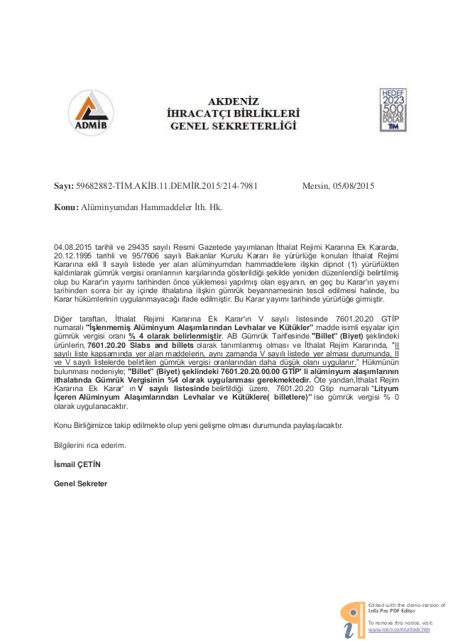 İthalat Rejimi Kararına Ek Karar'ın V sayılı listesinde 7601.20.20 GTİP numaralı "İşlenmemiş Alüminyum Alaşımlarından Levhalar ve Kütükler” madde isimli eşyalar için gümrük vergisi oranı % 4 olarak belirlenmiştir.