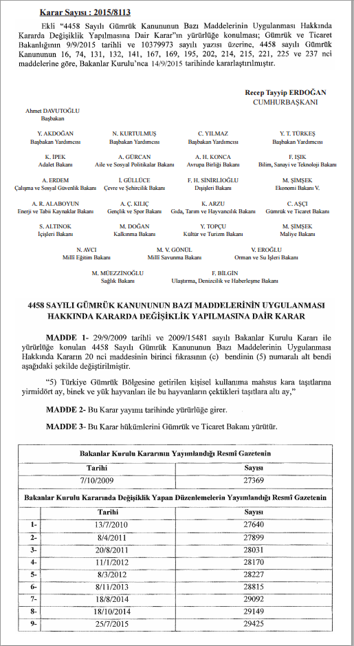 4458 Sayılı Gümrük Kanununun Bazı Maddelerinin Uygulanması Hakkında Kararda Değişiklik Yapılmasına Dair Karar