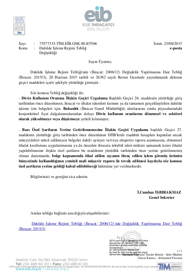 Dahilde İşleme Rejimi Tebliği'nde (İhracat: 2006/12) Değişiklik Yapılmasına Dair Tebliğ (İhracat: 2015/3), 20 Haziran 2015 tarihli ve 26382 sayılı Resmi Gazetede yayımlanarak eklenen geçici maddeleri içerir şekliyle yürürlüğe girmiştir. Söz konusu Tebliğ değişikliği ile;...